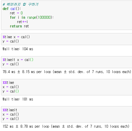 | %%timeit | 셀 | %를 두개 적으면, Cell 전체에 적용이 됩니다. 즉, Cell 코드를 모두 반복 수행한 후 평균 시간을 측정하여 반환합니다. |