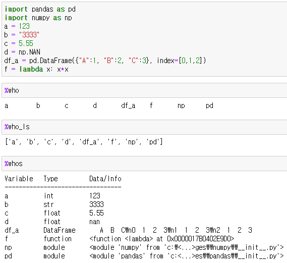 %who, %who_ls, %whos 일명 who 시리즈 매직 키워드는 현재 커널 메모리에 할당된 변수 정보를 반환해 줍니다.